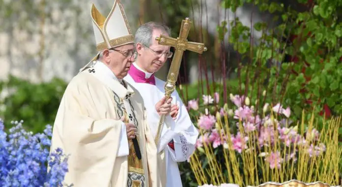 La Pascua “no es una fiesta con muchas flores”, prosiguió el pontífice argentino señalando a los jacintos, tulipanes y narcisos, además de ramos de rosas rosas, que decoraban las escaleras que llevan a la basílica.
