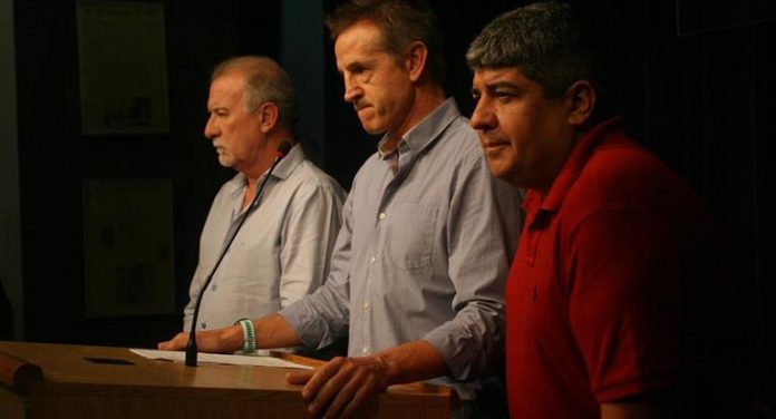 Jorge Sola, secretario de prensa la CGT, flanqueado por Pablo Moyano y Omar Plaini, realizó una evaluación del paro en una conferencia de prensa, donde señaló que “la medida de fuerza es contundente más allá de los piquetes, que pertenecen más a partidos políticos que a compañeros que protestan”.