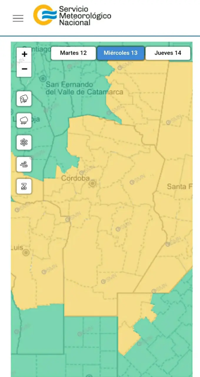 El Servicio Meteorológico Nacional emitió un alerta por tormentas fuertes para la zona de Punilla, Colón, Ischilín, Santa María y Totoral.
