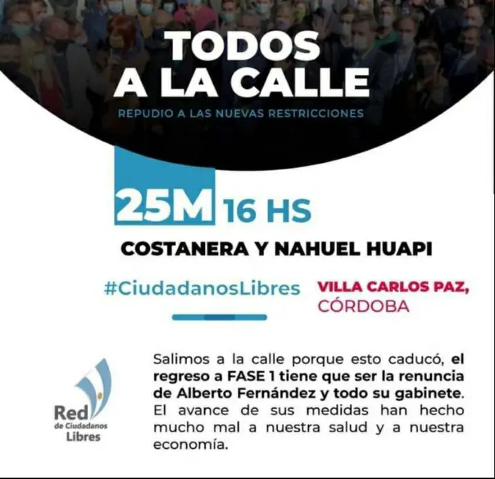 Este martes 25, Villa Carlos Paz replicará una marcha que se convoca a nivel nacional y que tiene como objetivo manifestarse en contra del confinamiento estricto que limita la posibilidad de trabajo a los rubros considerados como no esenciales.