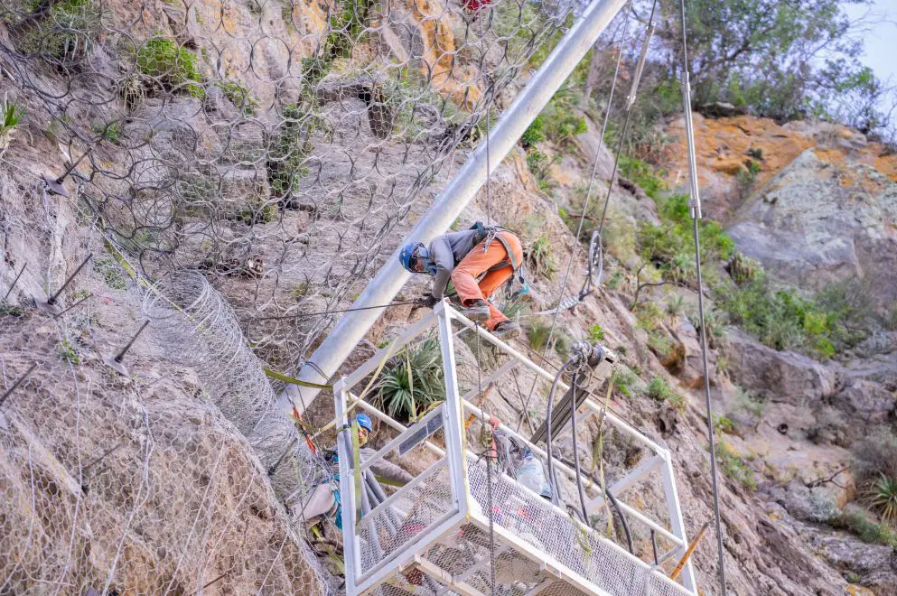 Las tareas incluyen la estabilización de laderas, con enmallado reforzado con cables de acero y anclajes especiales, la instalación de barreras dinámicas de protección y la construcción de defensas metálicas y de hormigón.