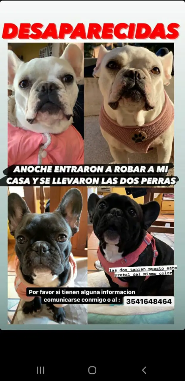 Una vecina de Santa Rita fue víctima de un robo en la noche de este sábado mientras se ausentó un par de horas de su casa. Además de los objetos materiales y del dinero que le llevaron, los ladrones huyeron en el auto familiar y se llevaron las dos perras raza Bulldog Francés.