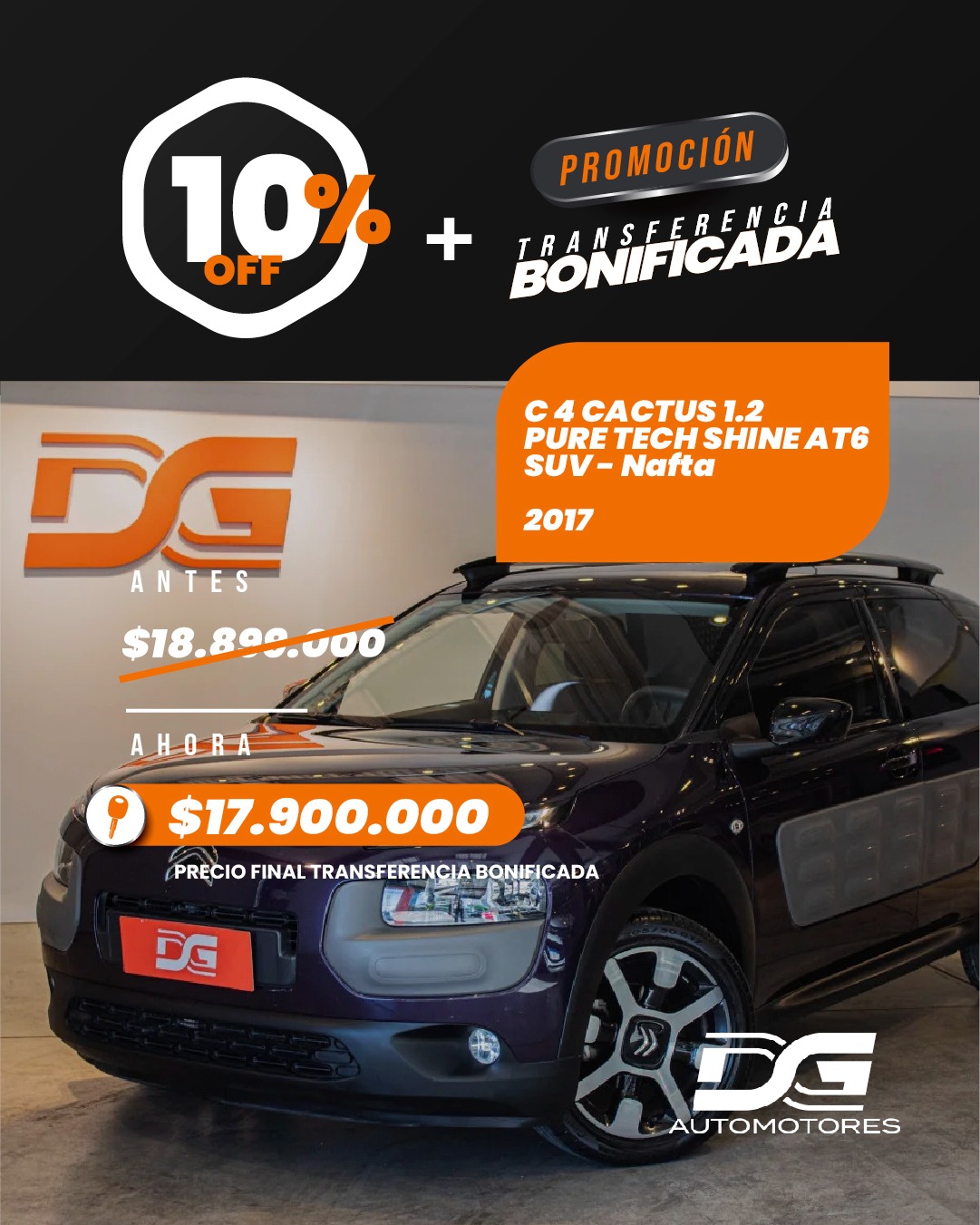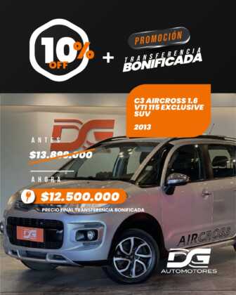 La promoción es válida por un período limitado y con stock disponible. Es sólo para operaciones de contado efectivo o con crédito bancario, no se recibe menor. Los interesados pueden consultar al 3541-608256 o visitar las sucursales de DG Automotores en Av. San Martín 1678 o Av Carcano 696 – Villa Carlos Paz.