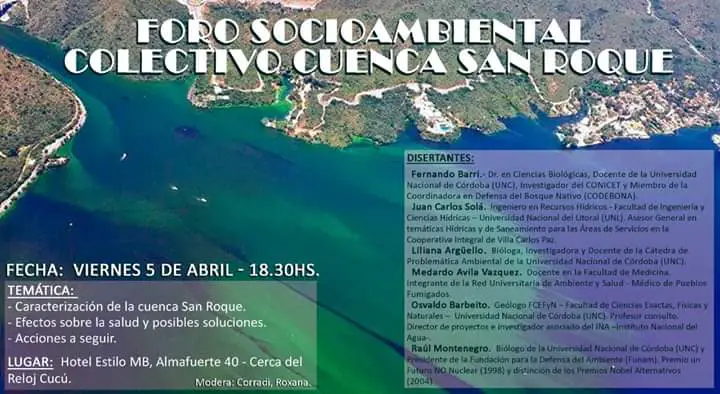 El próximo viernes 5 de abril a las 18:00hs. se llevará a cabo en el Hotel Estilo MB de Carlos Paz un Foro Socioambiental sobre la Cuenca San Roque.