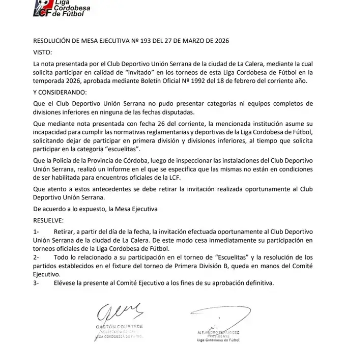 La resolución parte desde la incapacidad (según reconoce el propio club) de completar y presentar equipos en las categorias de divisiones inferiores.