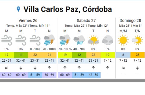 El domingo se espera un cambio de condiciones: cielo mayormente despejado, temperaturas en ascenso y sin probabilidad de lluvias. La máxima podría llegar a los 28 grados.