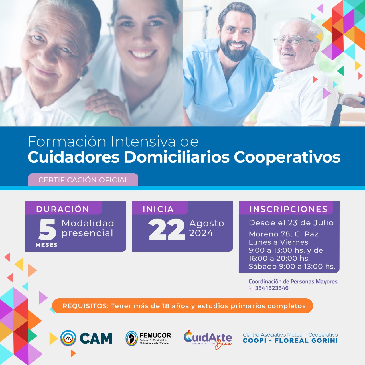 El 22 de agosto comenzará en Villa Carlos Paz la Formación Intensiva de Cuidadores Domiciliarios Cooperativos. Se trata de una capacitación impulsada por la cooperativa Cuidarte Bien, especializada en tareas de cuidados a personas adultas mayores y/o con discapacidad, con formación profesional.