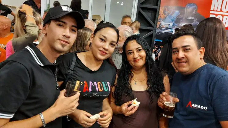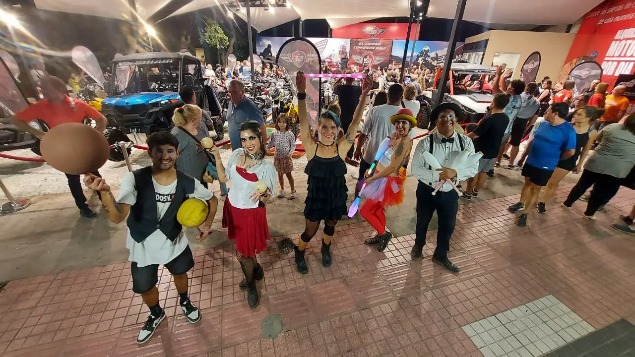 Una colorida y alegre pandilla de ‘saltimbanquis’ posa para la cámara de Carlos Paz Vivo… con el recientemente abierto espacio de Moto Café de fondo, en pleno centro de Villa Carlos Paz.