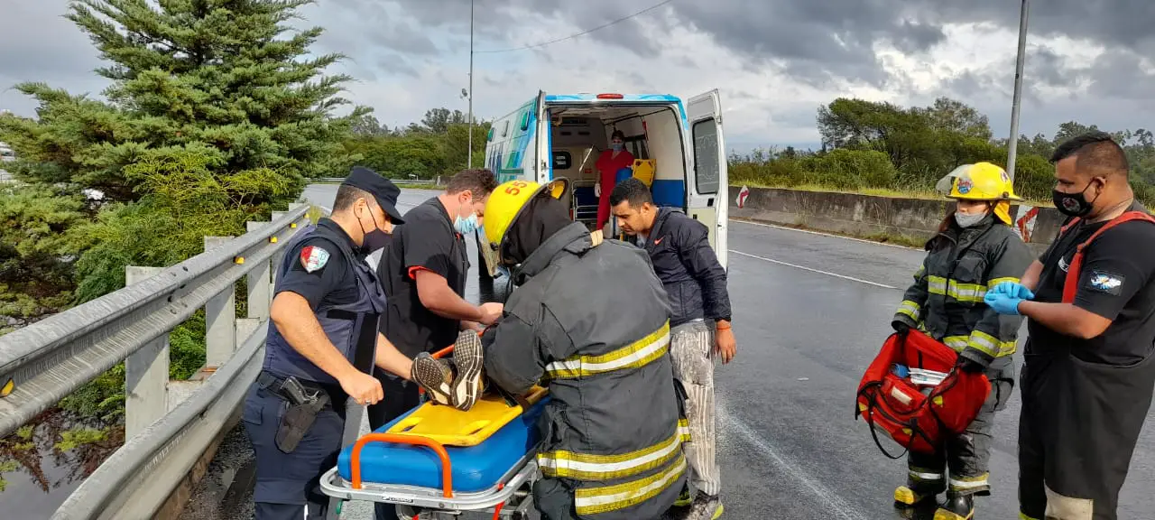 Con el asfalto mojado por la lluvia y por causas que aún se tratan de establecer, el vehículo en el puente de acceso, chocó con el guadarrail y dio un giro.