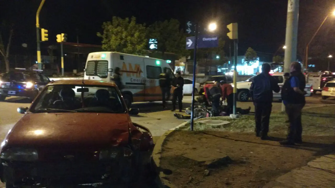 La colisión en entre una moto y un automóvil se produjo en la intersección de las calles Pte. Perón y Champaquí arrojó como saldo un herido que tuvo que ser hospitalizado en la noche del viernes.