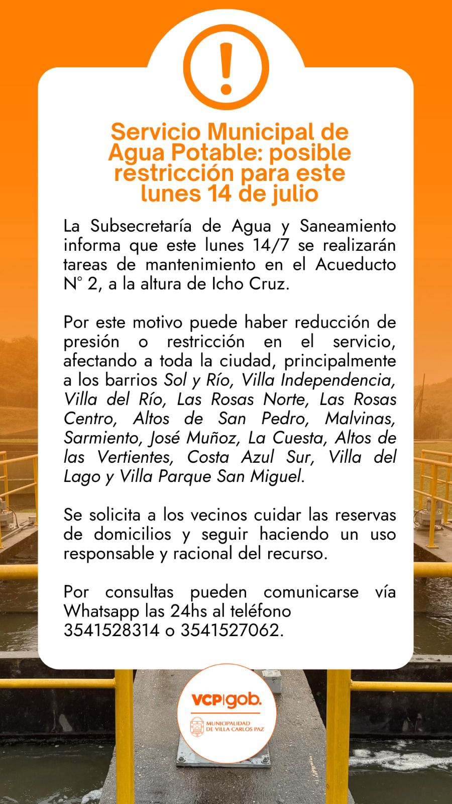 La Municipalidad de Villa Carlos Paz informó que este lunes 14 de julio se podrían registrar inconvenientes en el suministro de agua potable en distintos sectores de la ciudad, debido a tareas de mantenimiento programadas sobre el Acueducto N° 2, a la altura de Icho Cruz.