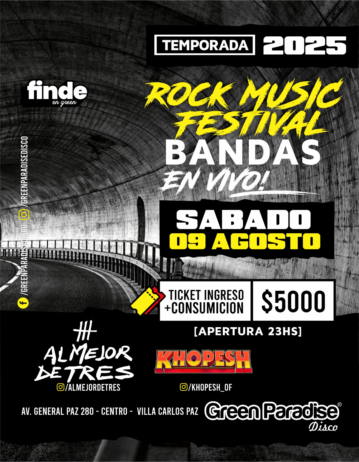 El sábado 9 es para los amantes del rock: vuelve el Rock Music Festival, con la potencia en vivo de Al Mejor de Tres y Khopesh. Una noche de amigos, guitarras y energía pura. Ingreso + consumición: $5000. Apertura 23hs.