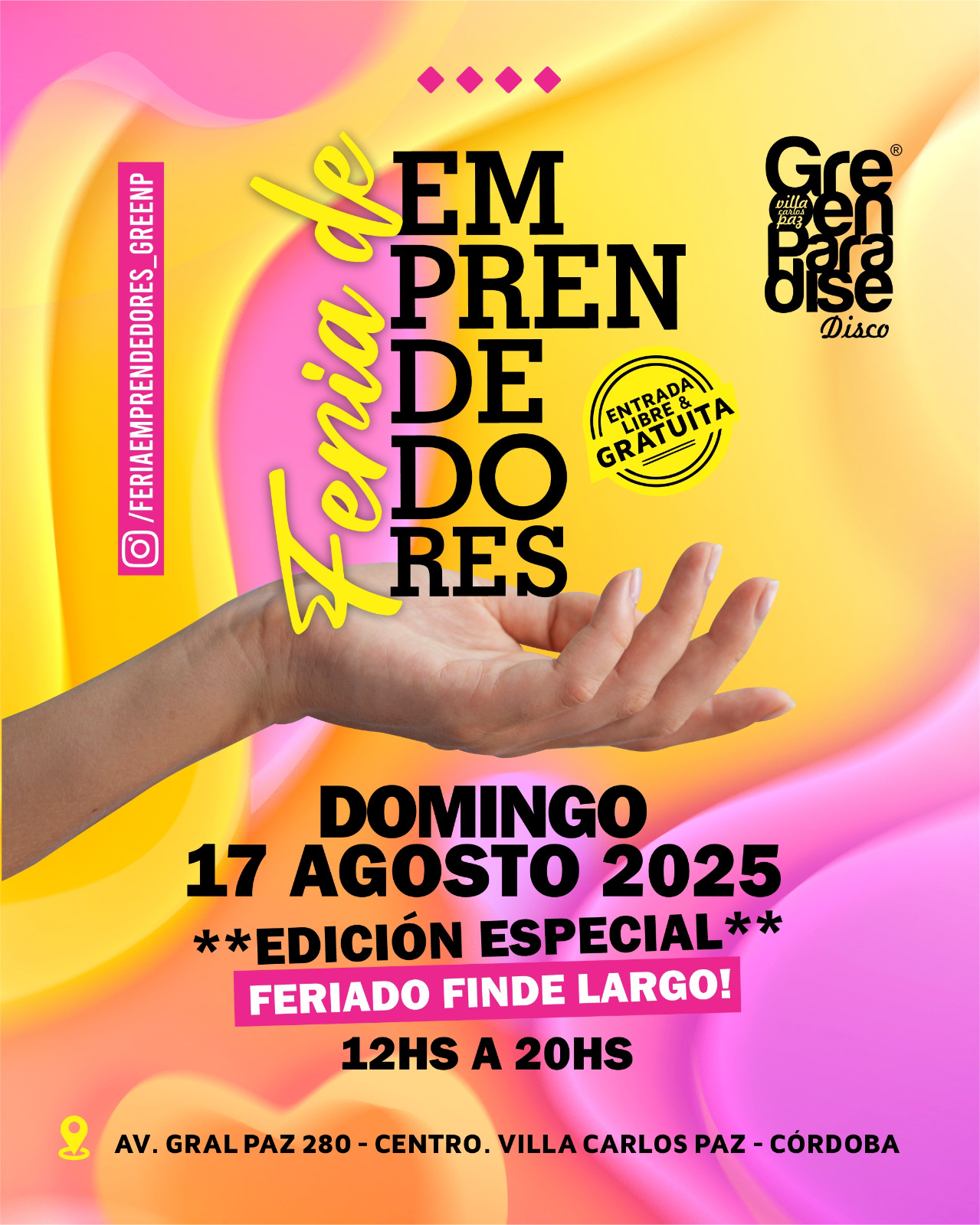 Y para cerrar el finde el domingo 17 llega la Feria de Emprendedores Green Paradise: más de 40 stands, cosmética, deco, servicios, hobbies, todo en un mismo lugar. Entrada libre y gratuita, de 12 a 20hs. Ideal para ir con amigos o en familia, disfrutar del bar, las promos, la música funcional y el espacio de encuentro con proyectos locales.