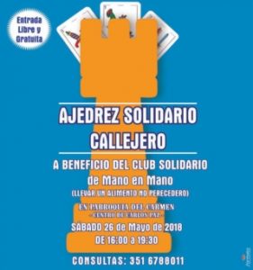 Se llevará acabo el sábado 26 en el horario de 16.30 a 19.30 el “Ajedrez Callejero Solidario” a beneficio del Club Solidario “de mano en mano”, frente a la Iglesia del Carmen, en pleno centro de la ciudad.