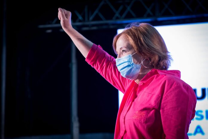 La candidata a senadora nacional de Hacemos por Córdoba, Alejandra Vigo, encabezó este viernes a la noche un acto en la cancha del Club Villa Azalais de Córdoba Capital.