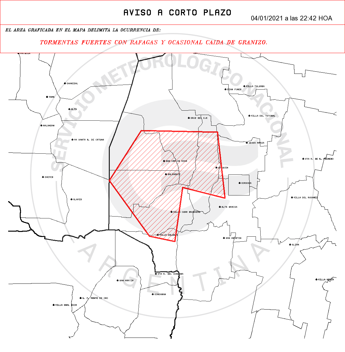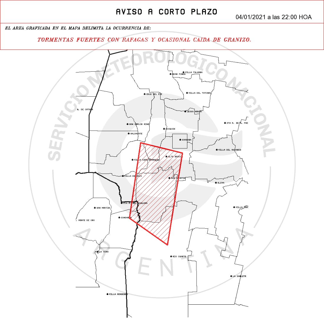 El Servicio Meteorológico Nacional emitió dos alertas de corto plazo por tormentas fuertes con probable caída de granizo para el Valle de Punilla, Colón, Cruz del Eje, Minas, Pocho, Calamuchita, Río Cuarto, San Javier, San Alberto, Santa María y Tercero Arriba.