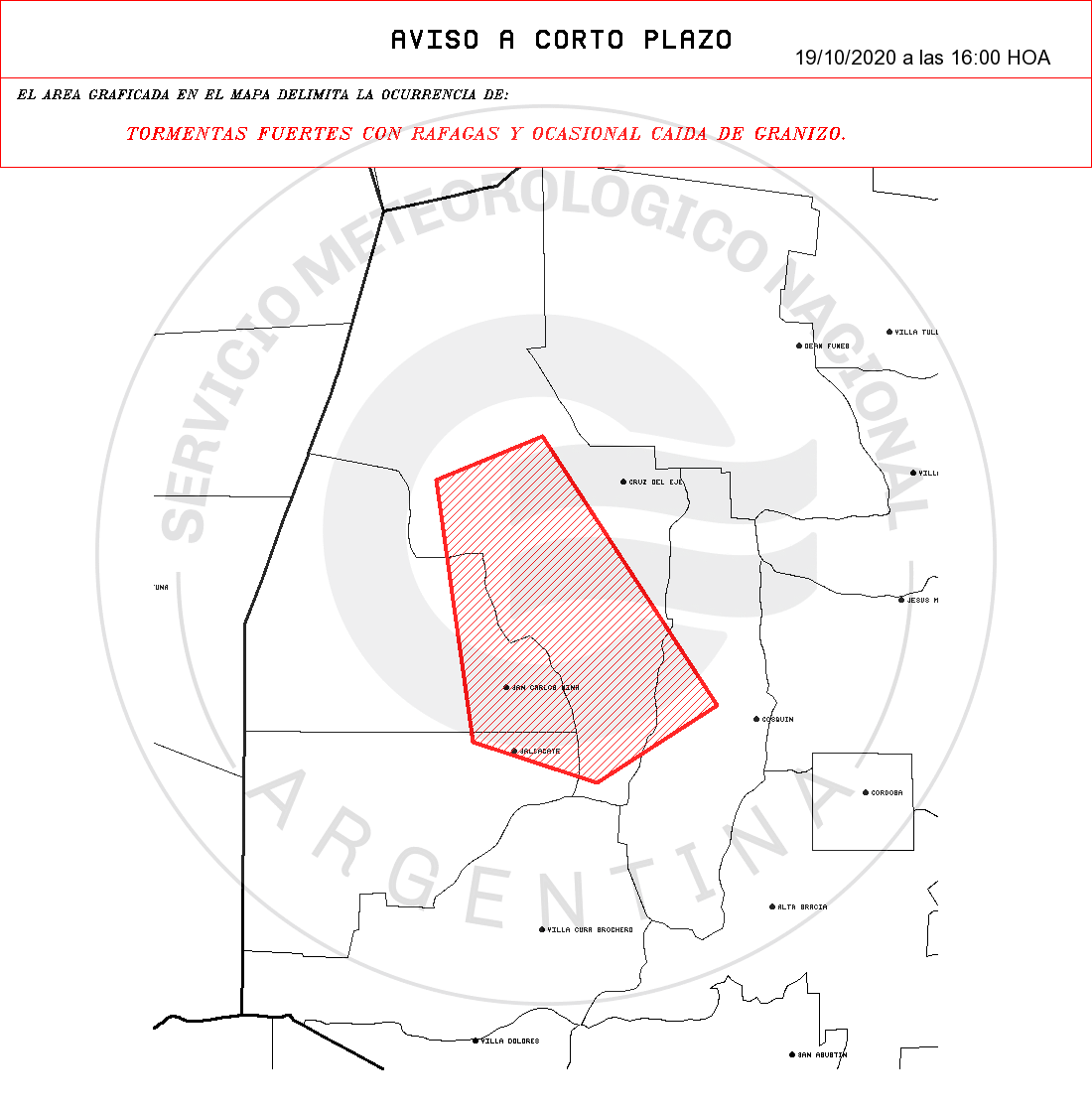 El Servicio Meteorológico Nacional emitió un aviso de corto plazo en el que advierte la posibilidad de caída de granizo en Punilla.