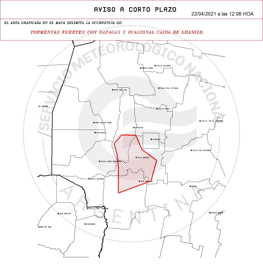 El aviso rige hasta tres horas posteriores a su emisión y esta vez alcanza los departamentos de Punilla, Calamuchita y Santa María.