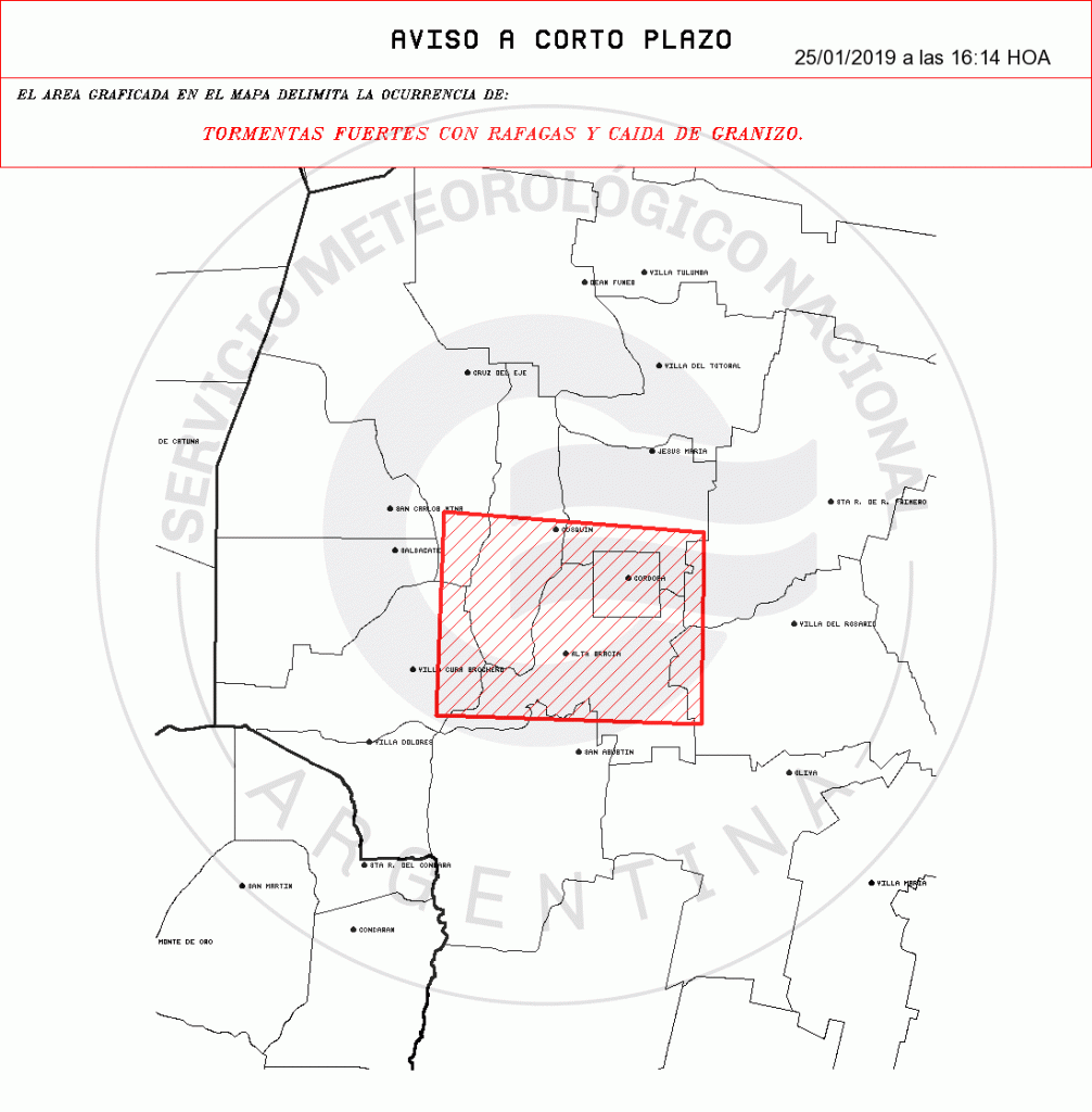 El alerta meteorológico abarca además a las regiones de Calamuchita, Colón, Córdoba, Cruz del Eje, Río Primero, Río Segundo, San Alberto y Santa María.