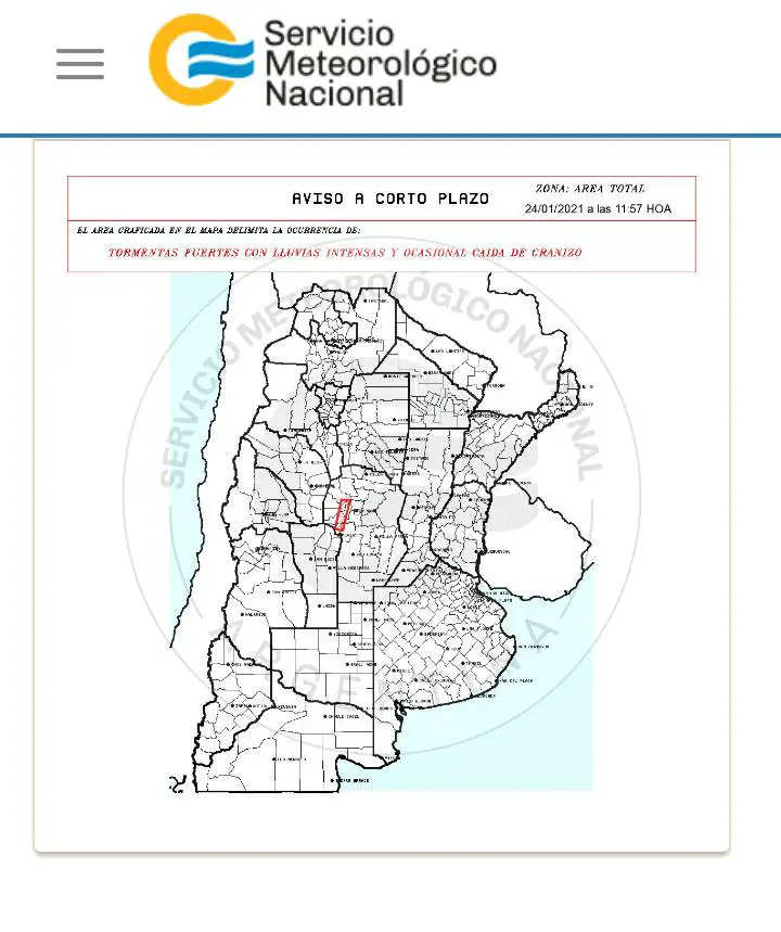 El Servicio Meteorológico Nacional emitió un “Aviso a corto plazo” por tormentas fuertes con lluvias intensas y ocasional caída de granizo.