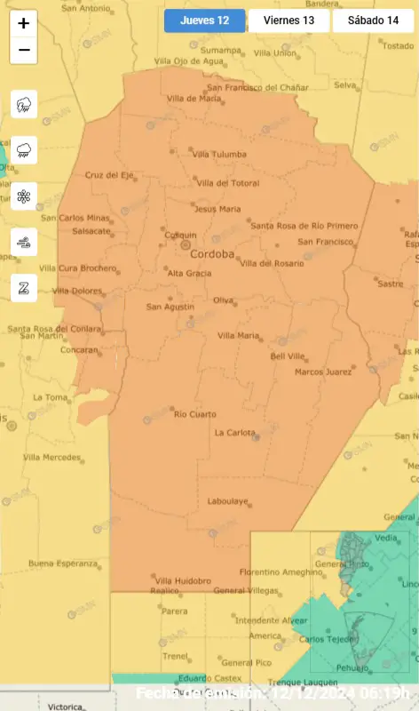 Este jueves por la mañana, el Servicio Meteorológico Nacional, SMN, emitió un alerta naranja para Punilla, esta noche, mientras que para el sur de la provincia de Córdoba, el alerta comienza desde la tarde.