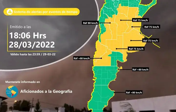 El Servicio Meteorológico Nacional (SMN) emitió un alerta amarilla por fuertes vientos en toda la provincia para este martes, 29 de marzo, por la noche y la madrugada del miércoles.