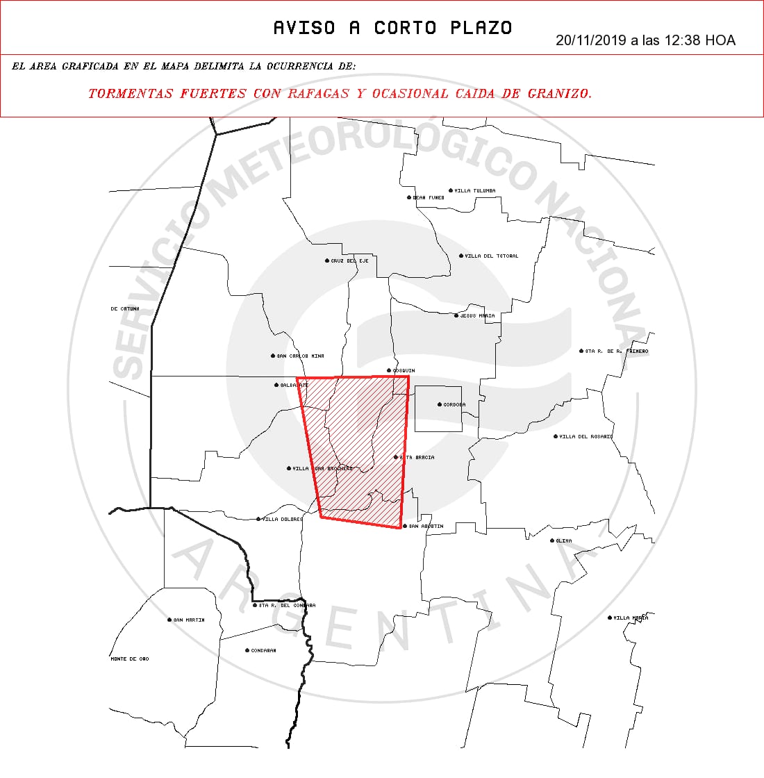 Las zonas abarcadas por el alerta son los departamentos Capital, Punilla, Calamuchita, Colón, Cruz del Eje, Pocho, San Alberto y Santa María.