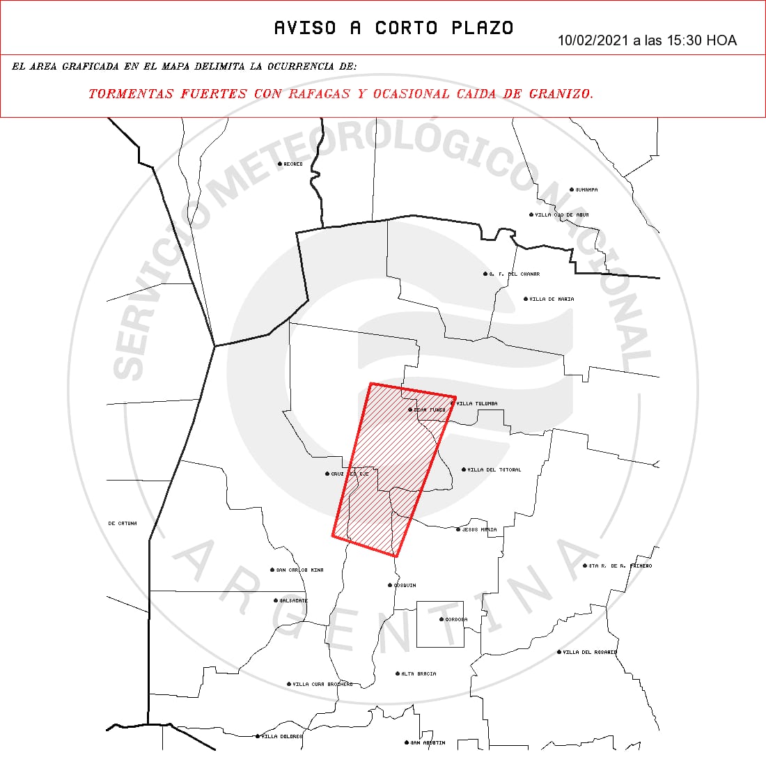 El Servicio Meteorológico Nacional, emitió una alerta por tormentas fuertes con ráfagas de viento y ocasional caída de granizo a las 15,30 hs del día de hoy, para Colón, Ischilín, Norte de Punilla, Cruz del Eje, Totoral y Tulumba.