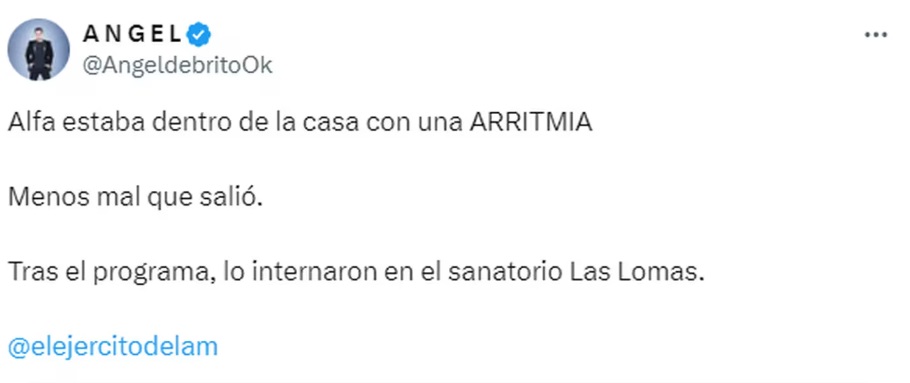 En medio de la polémica por su salida de la casa de “Gran Hermano”, Alfa fue internado de urgencia tras sufrir una arritmia. A través de las redes sociales, el periodista Ángel de Brito confirmó el traslado al sanatorio Las Lomas, de acuerdo con lo informado por TN.