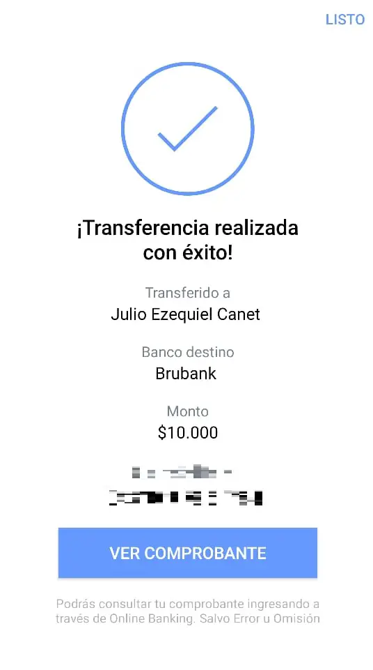 Comprobante de transferencia correspondiente a la seña: