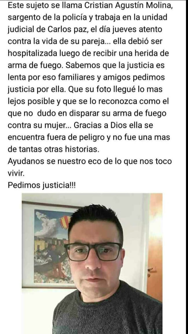 Adrián asegura que quiere llegar hasta las últimas consecuencias para que se haga justicia en el caso de su madre y que el policía pague por lo que hizo. El sargento Cristian Molina se desempeñaba en el área de la Unidad Judicial de la Departamental Punilla y fue imputado por la fiscal Jorgelina Gómez del delito de homicidio calificado en grado de tentativa agravado por violencia de género.