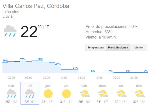 En sitios especializados en meteorología como Weather y Windgurú pronostican caída de precipitaciones para la madrugada de este miércoles, así como también un marcado descenso en la temperatura.
