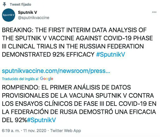A través de su cuenta de Tweet, indicaron que la «eficacia de la vacuna Sputnik V ascendió al 92% , cálculo basado en los 20 casos confirmados de COVID-19 divididos entre las personas vacunadas y las que recibieron el placebo», se informó hoy desde Rusia.