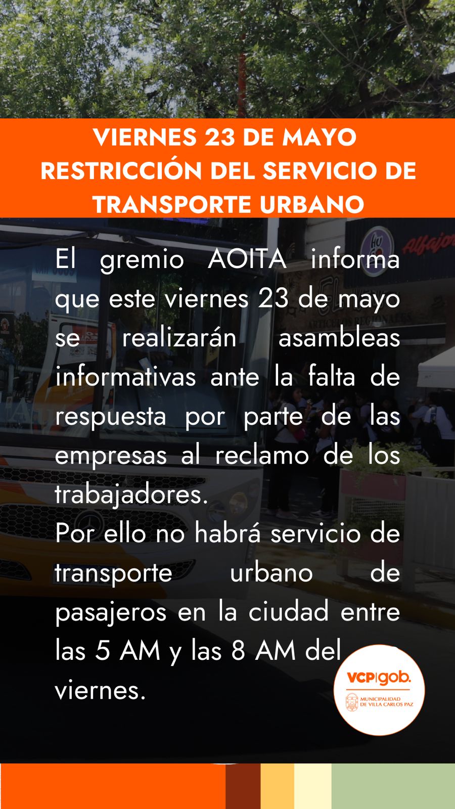 El servicio regular de transporte urbano de Carlos Paz y el interurbano provincial se verá afectado por la medida adoptada por el gremio AOITA que vuelve al plan de lucha para solicitar un incremento en los haberes de los trabajadores.