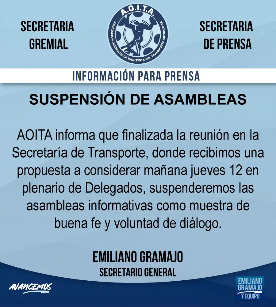 Sin embargo, durante las primeras horas de la tarde de este miércoles, AOITA comunicó que se levantaba la asamblea “como muestra de buena fe y voluntad de diálogo”. También habrá transporte normal este jueves.