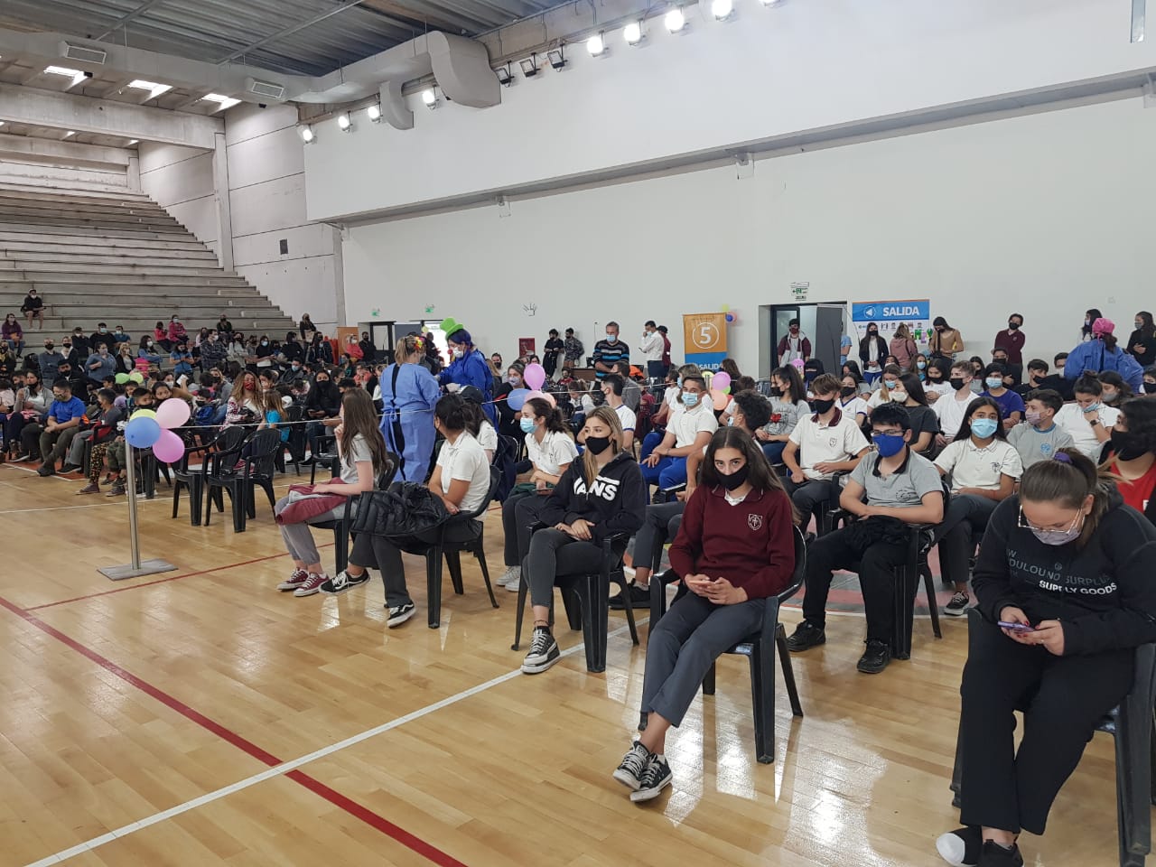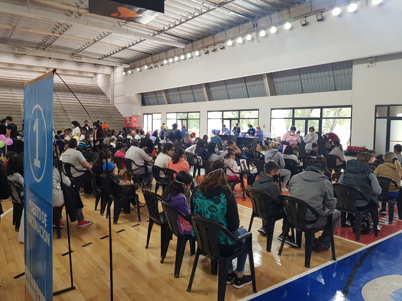 Con el objetivo de generar mayor empatía en los más pequeños y lograr que pierdan un poco el miedo a la aguja y a las batas quirúrgicas que se ponen para protegerse del virus, las enfermeras se calzaron el traje de payaso y le pusieron color al estadio Arena.