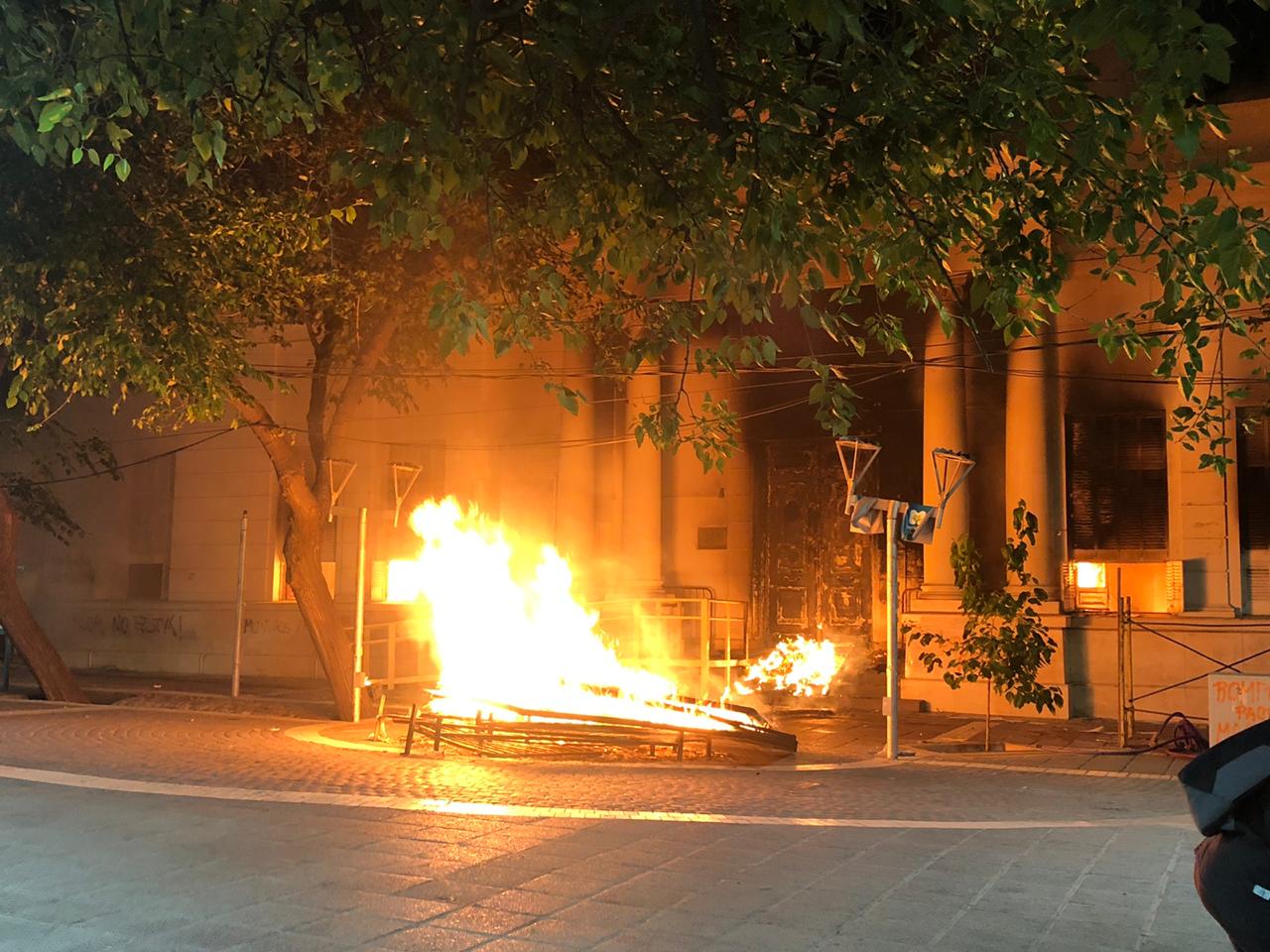 Una vez allí, algunos de los participantes de la manifestación arrojaron piedras contra el frente, rompieron vidrios, prendieron fuego y realizaron pintadas en el edificio.