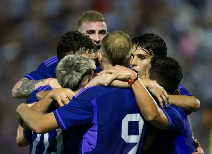 La probable formación Albiceleste para esta noche es la siguiente: Leandro Brey; Joaquín García, Marco Di Césare, Nicolás Valentini, Valentín Barco; Cristian Medina, Juan Sforza, Ezequiel Fernández; Pablo Solari, Luciano Gondou y Thiago Almada.