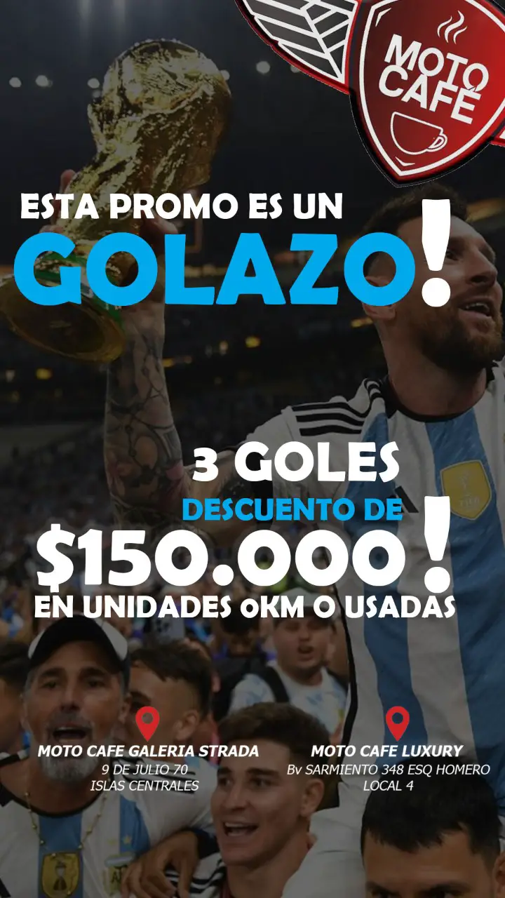 La alegría de la Copa del Mundo conquistada por la Selección Argentina no tiene fin y, tal cual lo prometido, Moto Café confirma su promoción de $50.000 de descuento por cada gol convertido durante el encuentro por nuestros jugadores.