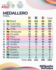 Ya terminado el certamen organizado por la ODESUR en Asunción, Paraguay, el elenco nacional cosechó un total de 197 medallas (58 de oro, 65 de plata y 74 de bronce) lo que posibilitó que se ubique en el tercer escalón del podio, dejando el primer puesto de Brasil (319 medallas) y el segundo puesto a Colombia (255 medallas).