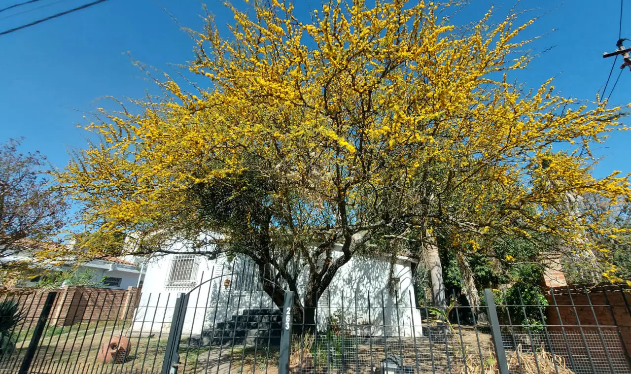 La primavera estalla en la flora autóctona incorporada en la jardinería del coqueto y residencial barrio José Muñoz, colgado del faldeo oeste del Cerro de la Cruz… sin importarle el calendario frío ni las placas de Cronica TV.