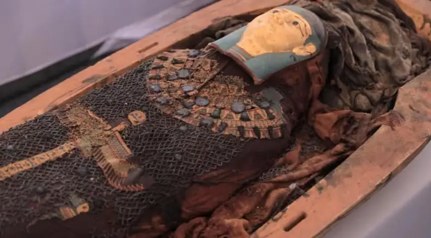 Este gracioso hallazgo se dio en el marco del desentierro de una necrópolis con sarcófagos decorados; el mismo data entre el 1550 y 1070 a.C.