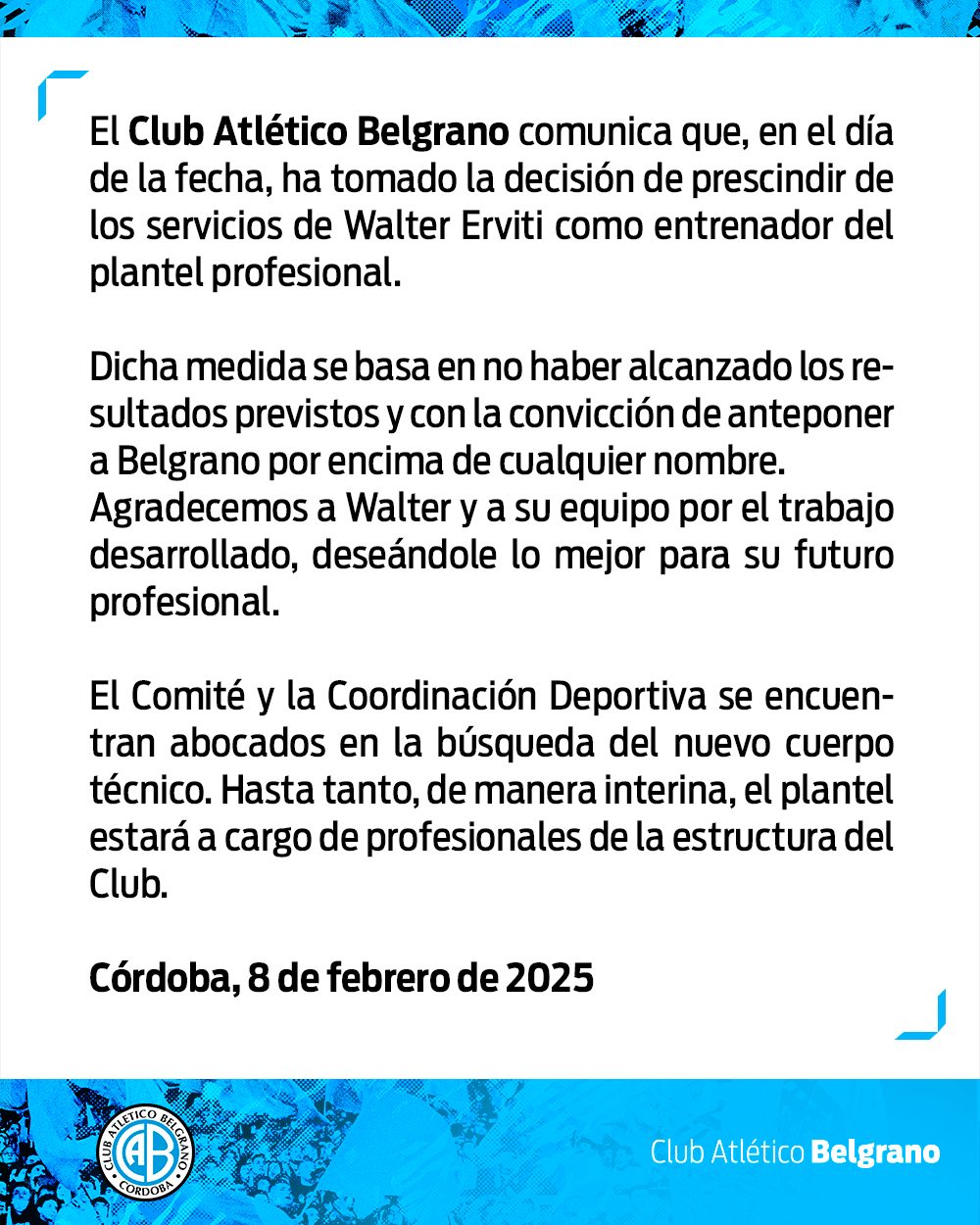 Tras los magros resultados obtenidos por Belgrano en las primeras fechas del torneo de la Liga Profesional, el presidente del club, Luis Fabián Artime, decidió rescindir el contrato del técnico Walter Erviti.