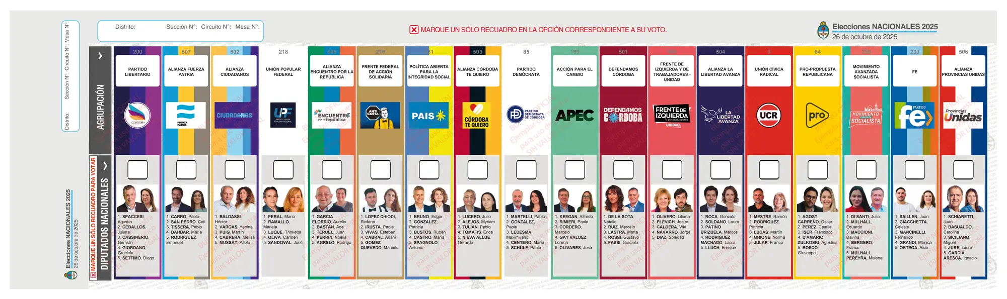 La Cámara Nacional Electoral (CNE) difundió el modelo de boleta que se usará en toda la provincia, donde cada espacio político cuenta con un recuadro que muestra a sus cinco primeros postulantes.