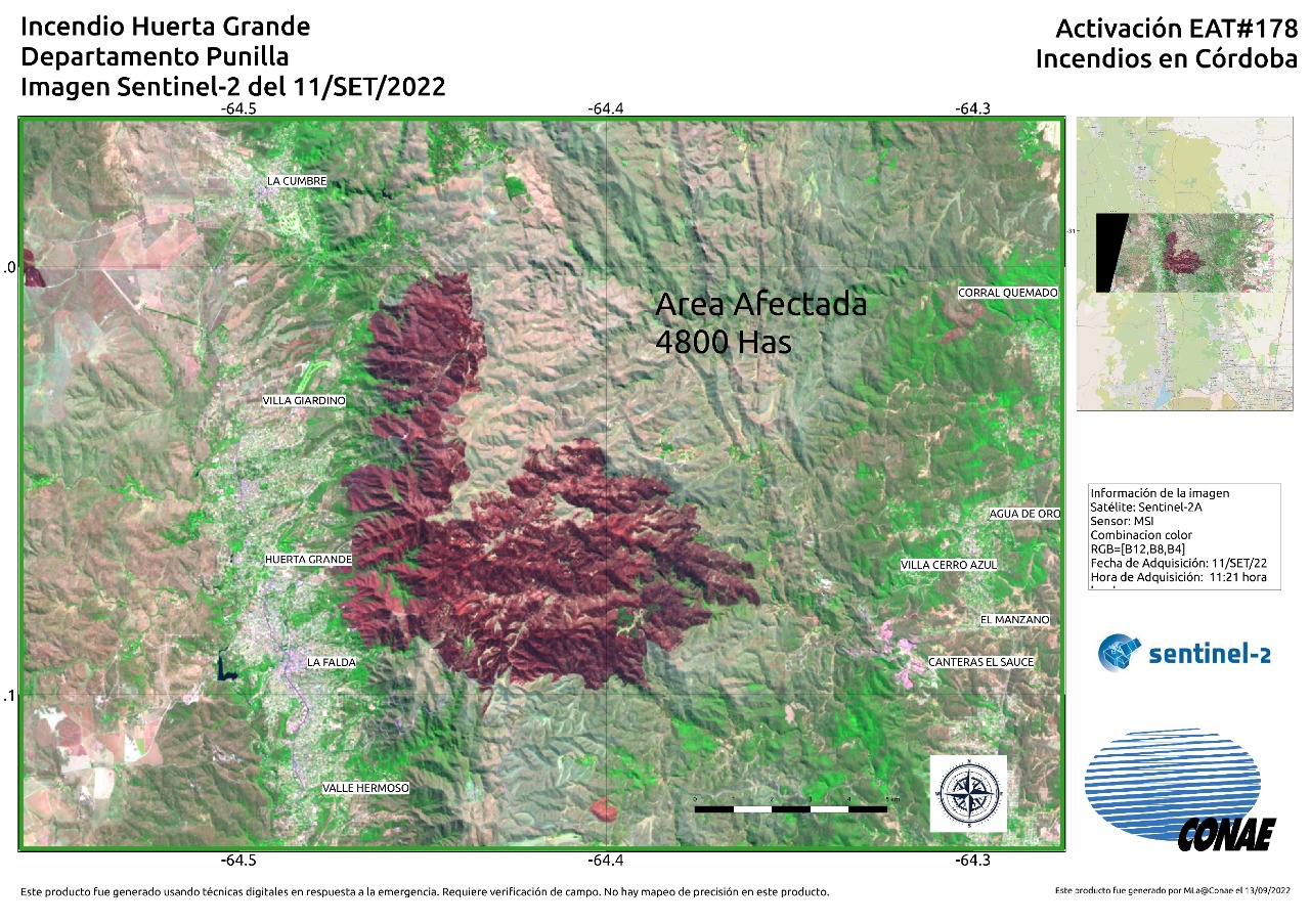 Y agregaron: “Los productos satelitales son distribuidos por la CONAE a instituciones nacionales y provinciales responsables de la gestión de la emergencia, como la Dirección de Análisis para la Reducción del Riesgo de Desastre del Ministerio de Seguridad de la Nación; Dirección Nacional del Servicio de Manejo del Fuego y Ministerio de Ambiente y Desarrollo Sostenible de la Nación”.