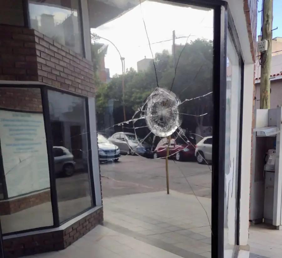 Es que autores desconocidos rompieron los vidrios de gran parte del frente del edificio. Al parecer, y por las características del impacto, habría sido con un palo.