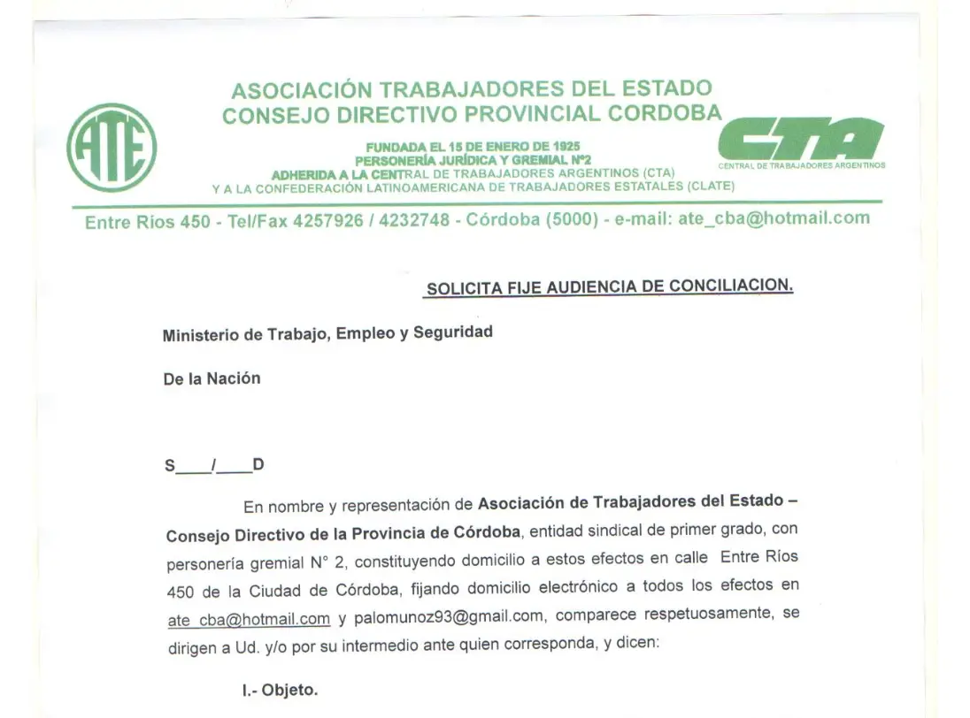 Con una nota presentada este viernes al Ministerio de Trabajo de la Nación, ATE Córdoba (Asociación de Trabajadores del Estado), solicitó que se fije una Audiencia de Conciliación con la Municipalidad de Villa Carlos Paz, para tratar «los alarmantes niveles de contratación precaria» que se registran en el municipio de la ciudad.