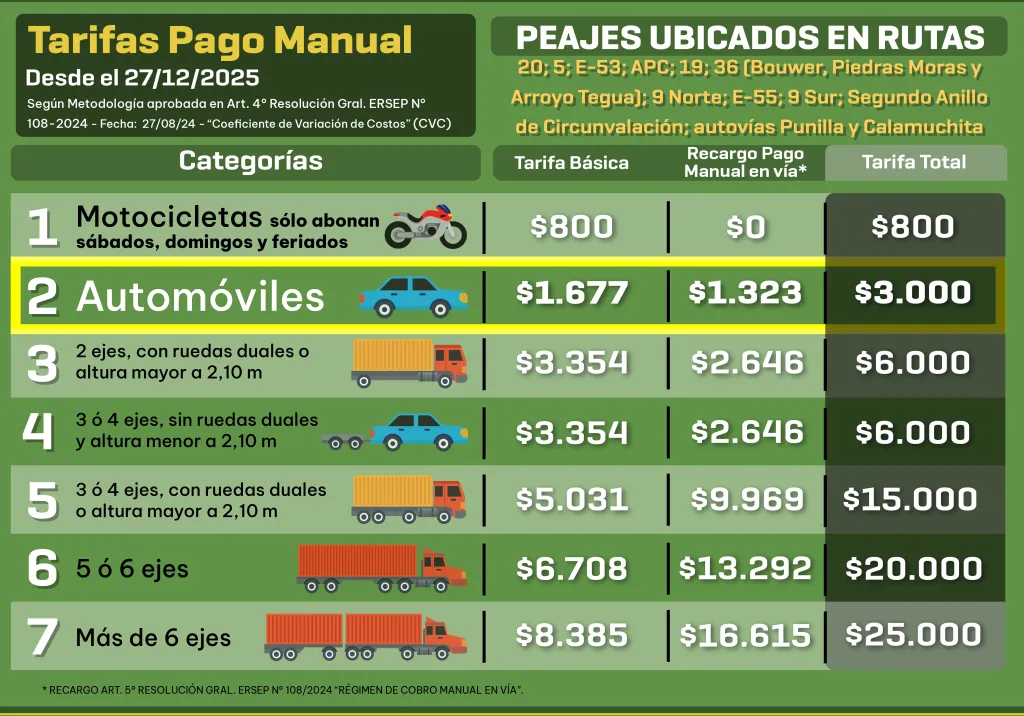 El cambio había sido anunciado días atrás por la empresa Caminos de las Sierras, pero comienza a aplicarse formalmente a partir de esta medianoche, marcando un significativo aumento del 50% en el pago en efectivo. Desde el sábado, los automóviles que abonen manualmente pasarán de $2.000 a $3.000 por pasada.