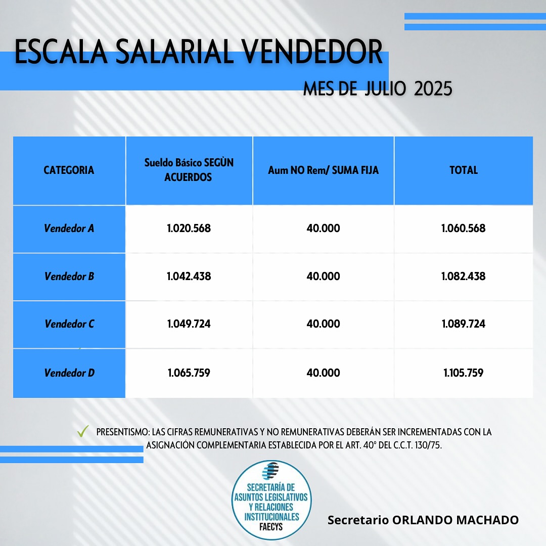 La Federación Argentina de Empleados de Comercio y Servicios (FAECyS) firmó este miércoles un nuevo acuerdo paritario con las cámaras empresariales del sector, que establece un aumento salarial del 6% en forma remunerativa y no acumulativa, a pagarse en seis tramos mensuales del 1% entre julio y diciembre de 2025.