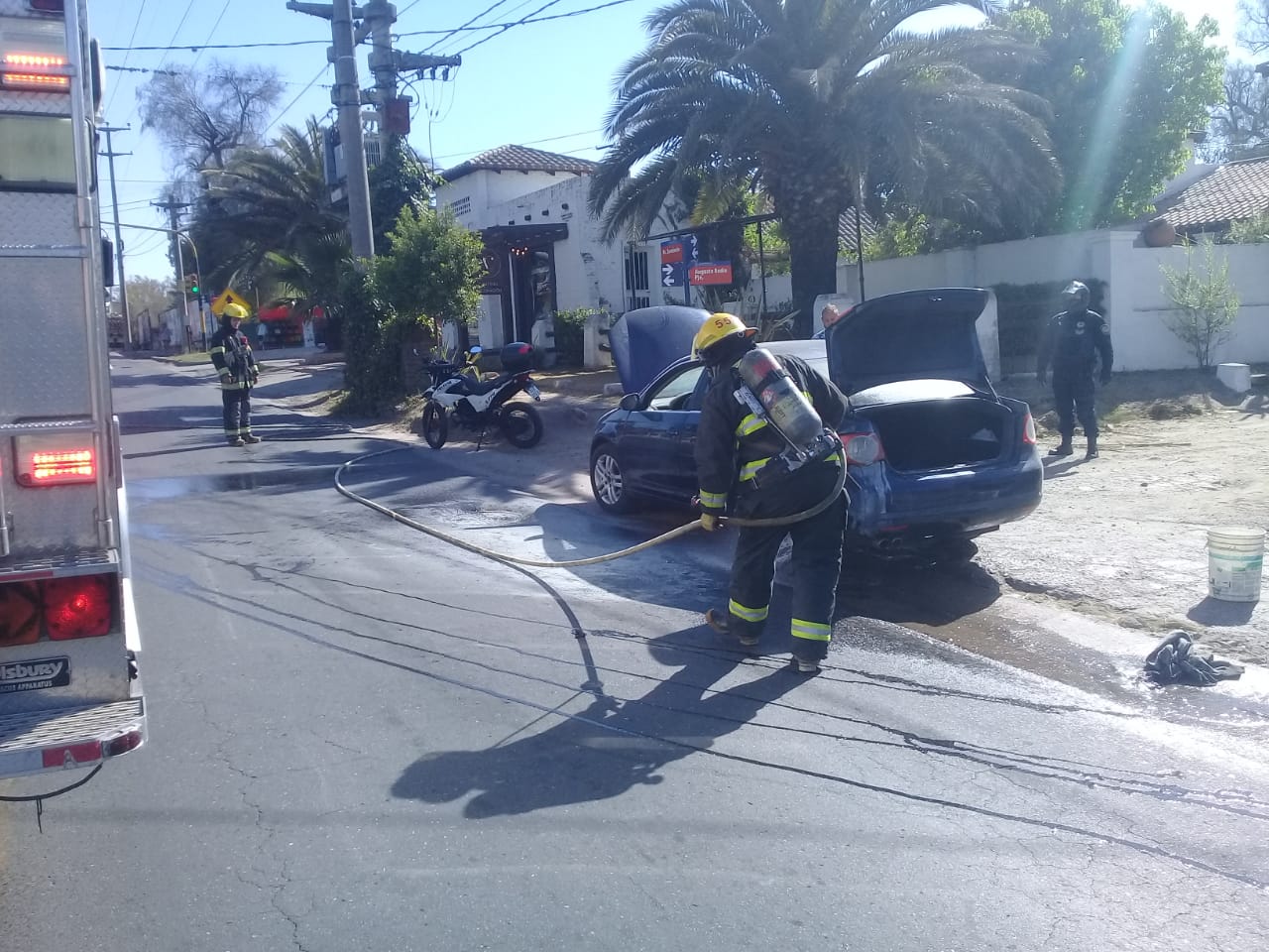 El mismo conductor logró contener las llamas que provenían de la parte trasera del Volkswagen Vento. Luego, trabajaron en el lugar los Bomberos Voluntarios.